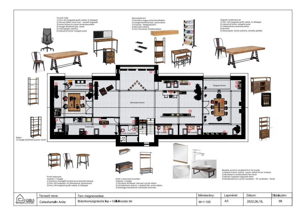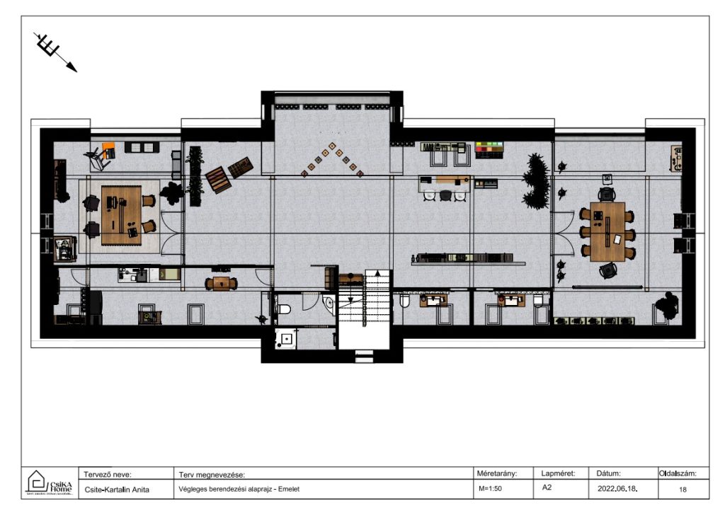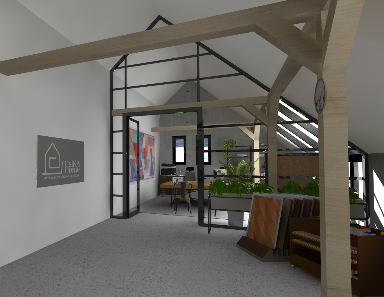 Egy családi ház tetőterében kialakított iroda, termékbemutató és tárgyaló terem végleges alaprajza.